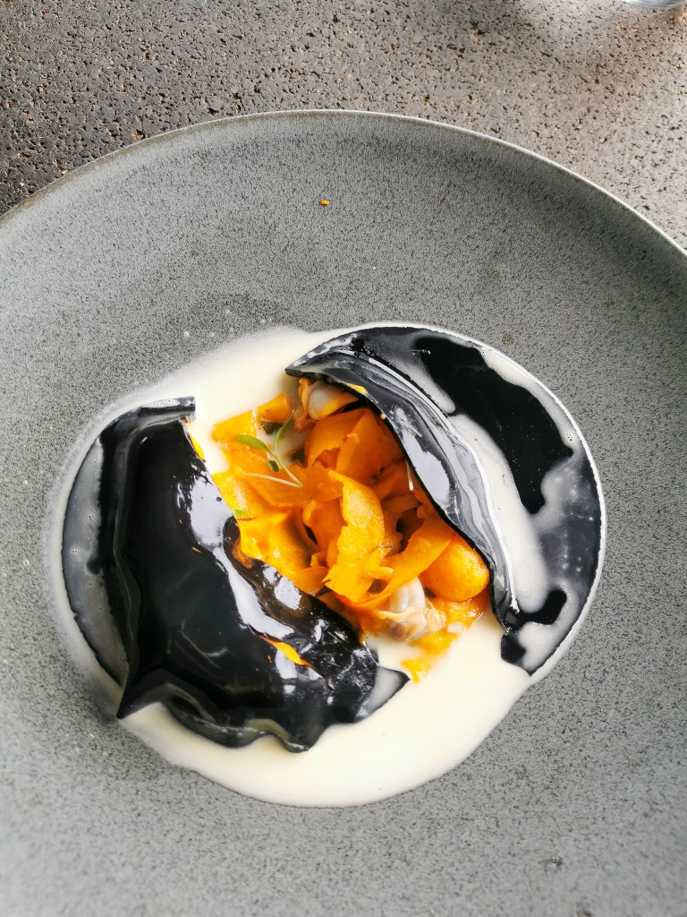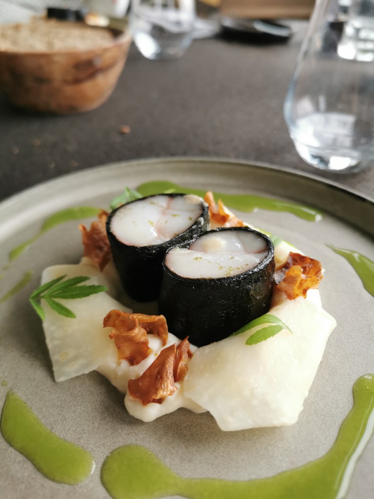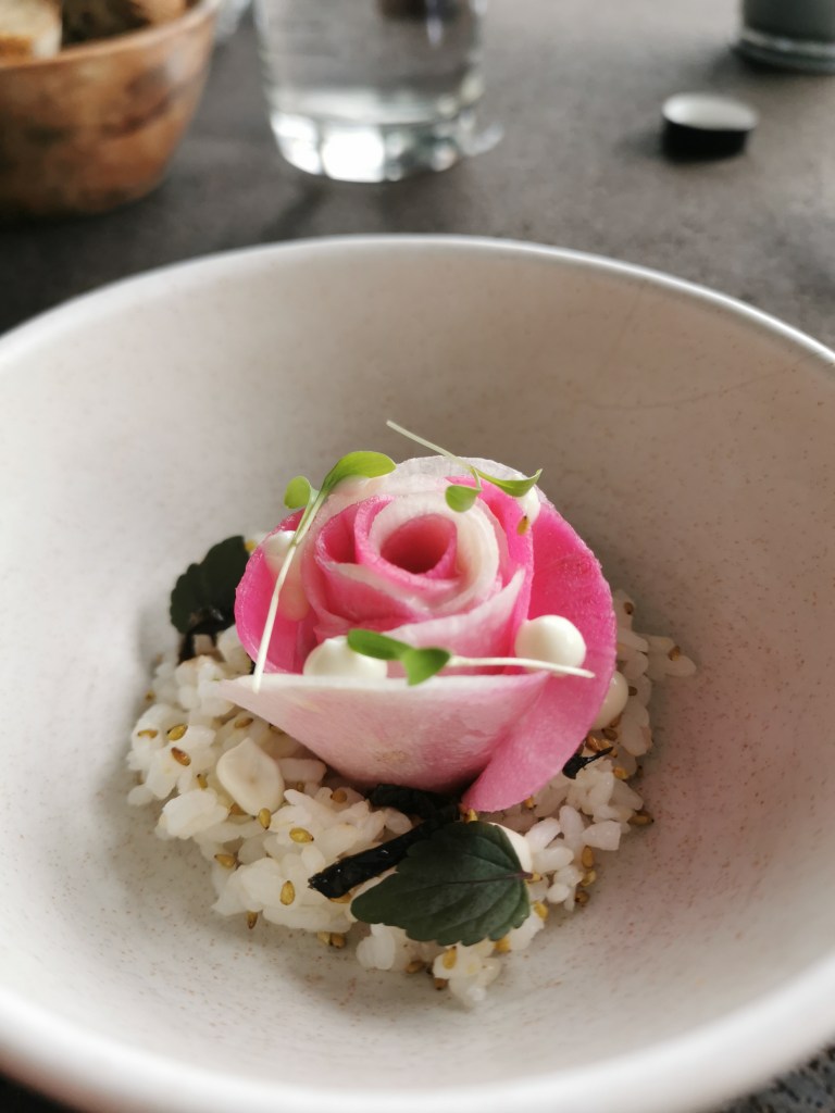 Le jour de ma venue, j’ai adoré la chips de tapioca et sa mayonnaise nappante au ras-el-hanout en amuse-bouche, tout comme la rose de radis délicatement posée sur du riz façon sushi. Coup de coeur également pour le potimarron légèrement acidulé et relevé d’une sauce aux coquillages, mais aussi les makis de lotte à la chair soyeuse accompagnés de céleri décliné sous toutes ses formes et d’une tonique sauce aux oursins.