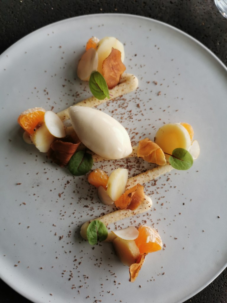 En dessert, Charles Moreau joue la carte de l’originalité avec du cerfeuil et de la clémentine travaillés aux côtés d’un rafraîchissant sorbet à la cardamome.