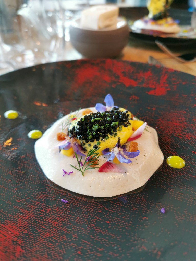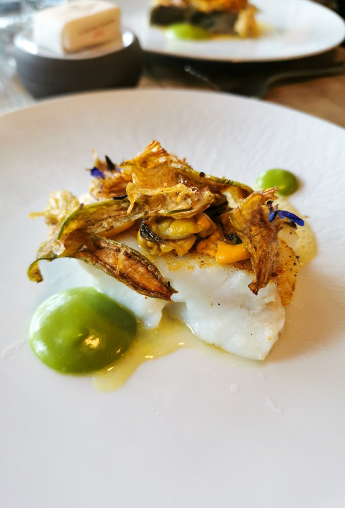 Le jour de ma venue, j’ai eu droit à un très beau saumon sous un voile de lait ribot et mayonnaise aux œufs de hareng fumé, de la Saint-Jacques mariée au chou-fleur et cresson, mais aussi un cabillaud skrei à la cuisson parfaite.