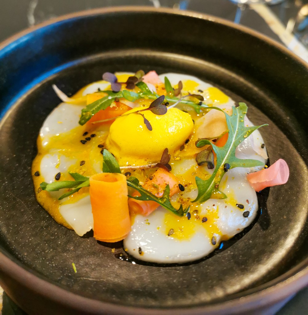 Installé sous la lumineuse verrière, vous dégusterez par exemple un Carpaccio de Saint-Jacques, carottes et fruit de la passion ou encore un Maquereau brûlé avec un petit tartare de betterave et pomme acidulée, mais aussi une émulsion au lait de coco pour la rondeur.