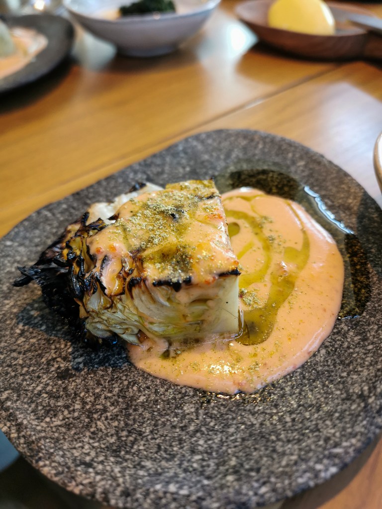 Citons par exemple le travail autour de la coquille Saint-Jacques et du chou, déclinés en trois petits « satellites » avec une assiette où le coquillage est cuit à basse température, réveillé par un bouillon à la capucine, avant d’être adouci au cœur d’un chawanmushi (crème aux oeufs japonaise). Coup de cœur pour la troisième déclinaison : un chou pointu laqué d’une concentration de chou et fumé au barbecue, avec lequel on vient racler une sauce coraillée teintée d’une belle acidité.