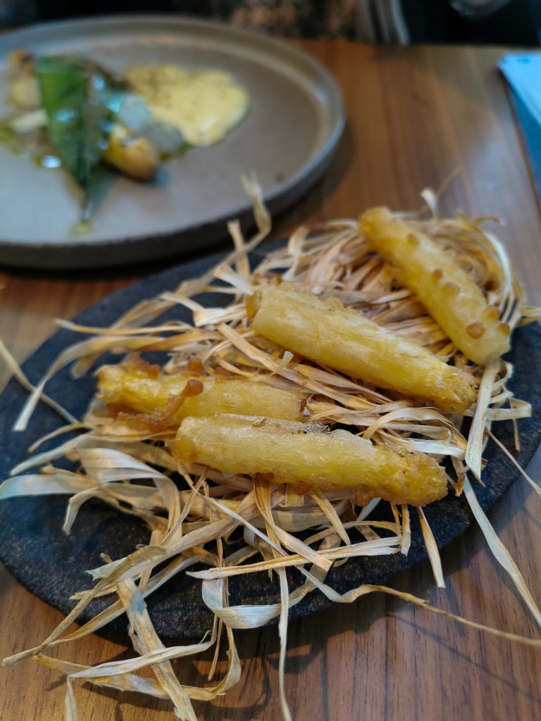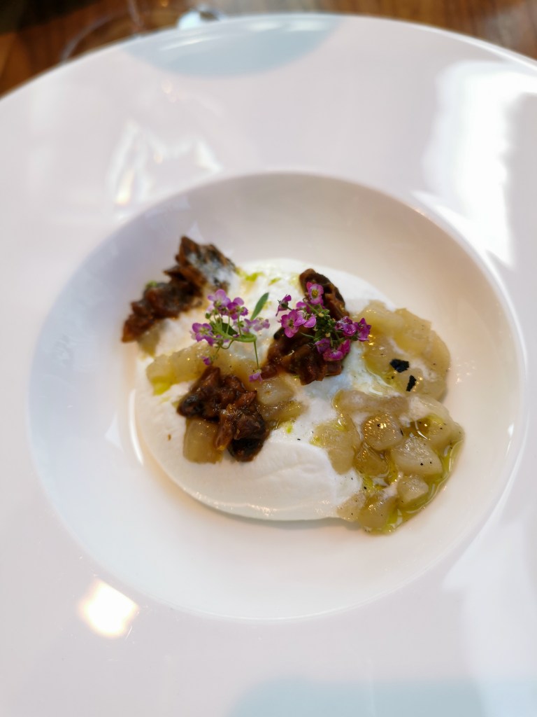 Nicolas Le Tirrand a également un faible pour les assiettes végétales, comme en témoigne l’asperge de la Torche saupoudrée d’un céleri saumuré râpé rappelant la salinité du parmesan et mariée à la vivacité d’un sabayon à l’ail des ours, mais aussi les cornichons d’asperges, d’abord fermentées puis cuites en tempura pour la gourmandise.