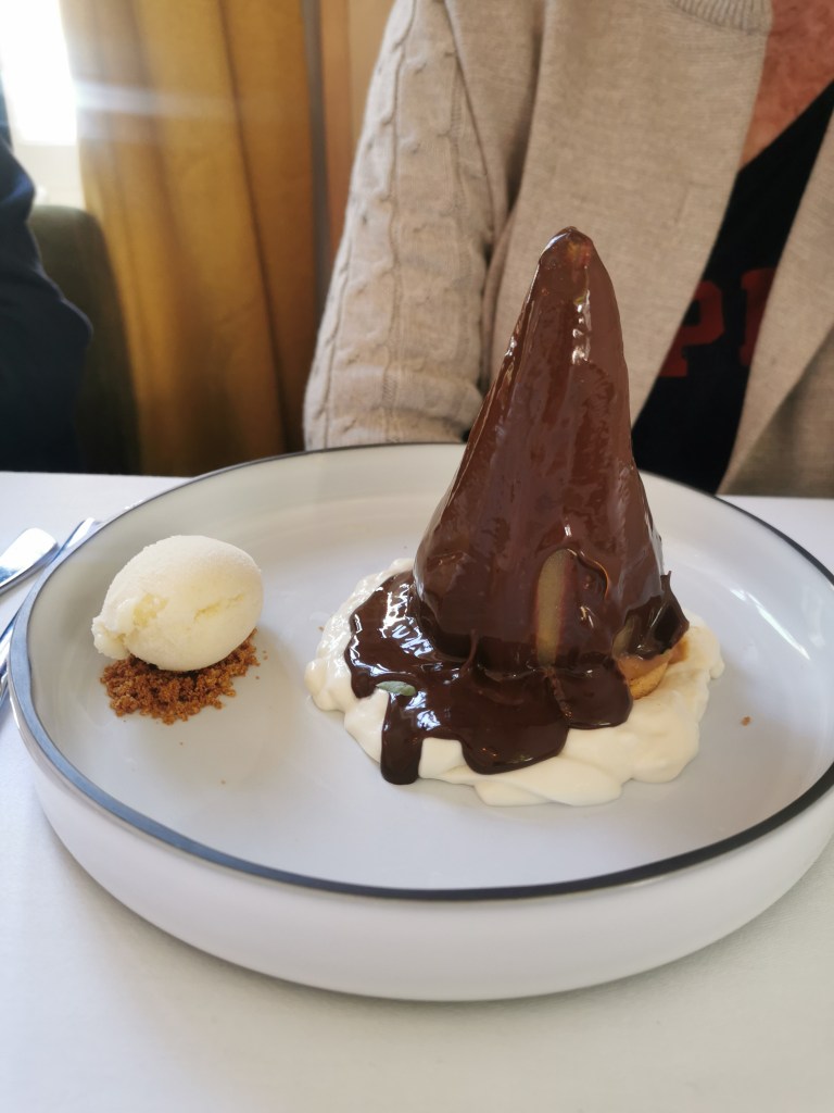 La générosité du couple se ressent jusqu’au dessert avec une poire pochée entière dans un sirop à la cannelle, nappée d’une sauce chocolat et d’une mousse vanillée pour la fraîcheur, ou encore un soufflé breton, accompagné d’un pruneau mariné et d’une glace caramel et sarrasin grillé. Mention spéciale pour le service adorable et souriant !