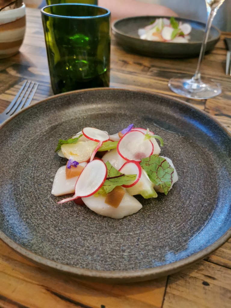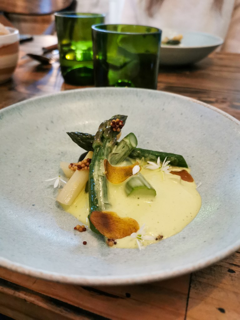 Le jour de ma venue, j’ai par exemple dégusté des asperges vertes, ail des ours et poutargue, des Saint-Jacques à la crème fumée, betterave et radis, du lieu jaune, pommes de terre nouvelles, cébettes et sauce XO, ou encore de la rhubarbe, sorbet lait ribot et miel… Un régal de bout en bout, à accompagner d’une belle sélection de vins nature ou en biodynamie.