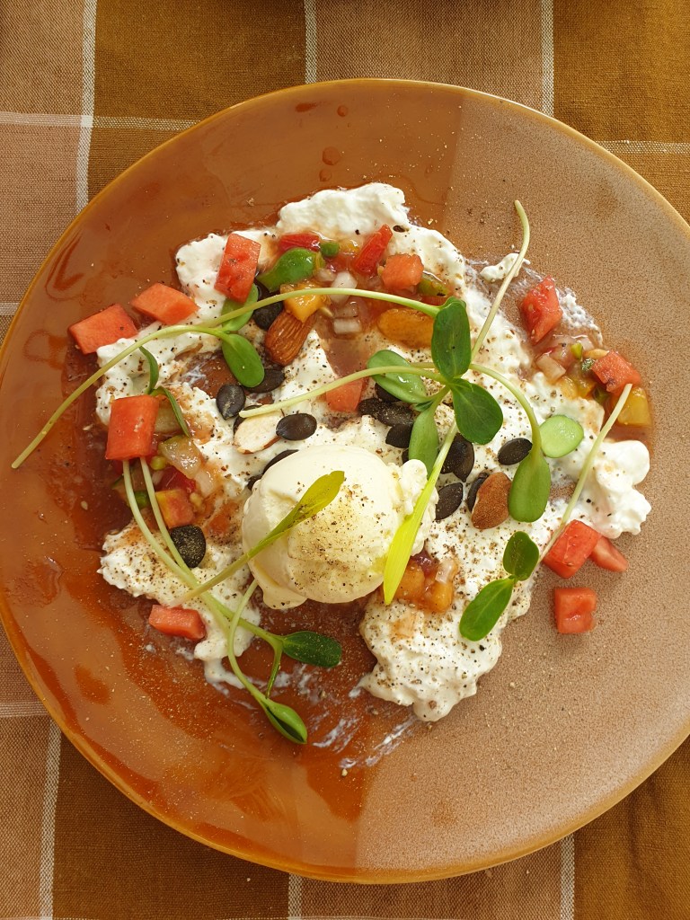 Ici, pas de menu mais une carte qui change au fil des jours selon les arrivages et les inspirations. Le jour de notre venue, les intitulés semblaient plus alléchants les uns que les autres, rendant la tâche du choix complexe. Nous avons finalement opté pour un bœuf Angus façon thaï en entrée d’une grande fraîcheur, relevé de quelques épices et herbes aromatiques, mais aussi la burrata travaillée de façon originale, avec un pistou mais surtout une glace à l’huile d’olive maison.