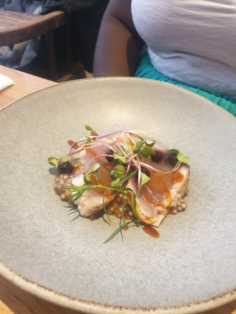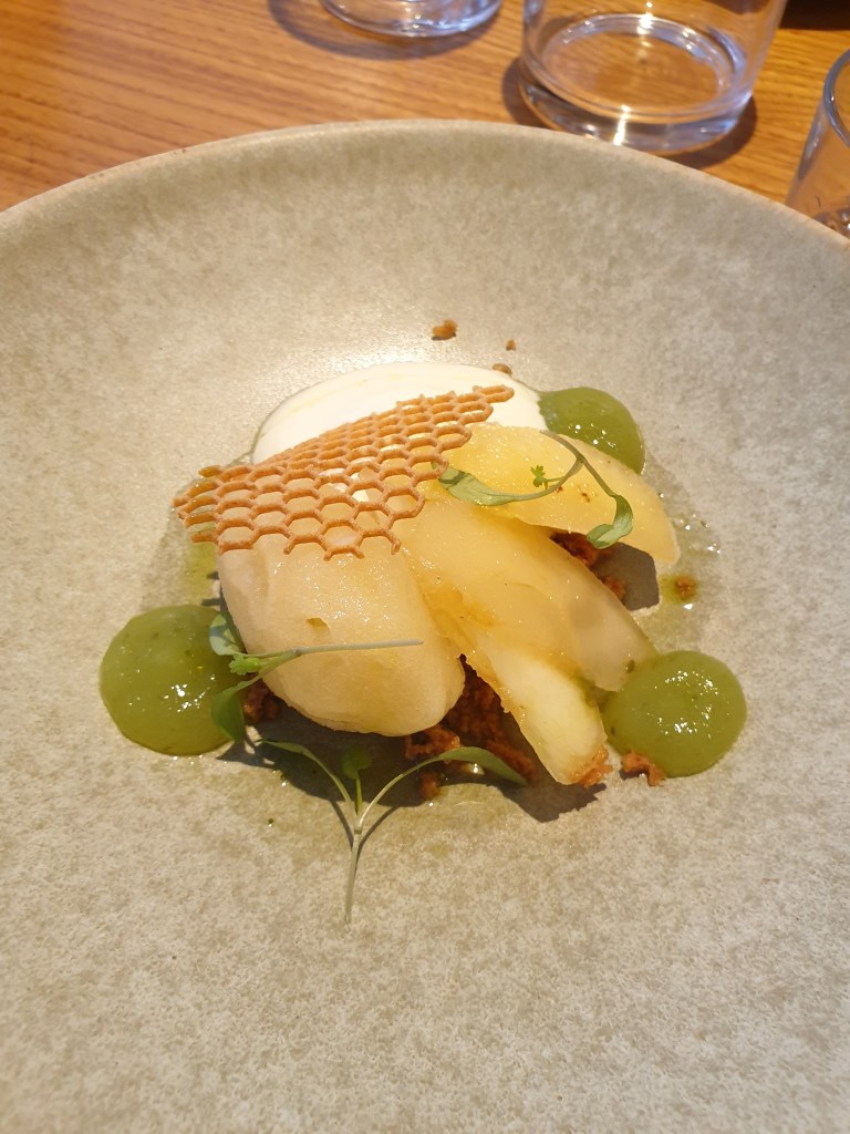 Au déjeuner, la carte très accessible change toutes les semaines et met l’eau à la bouche ! Thon blanc, perles du Japon et yuzu ; Haddock, beurre gochujang et focaccia ; Agneau, citron confit et laitue de mer ou encore Sébaste, wasabi et poireau crayon ne sont que quelques exemples des plats proposés, variant entre produits connus et réconfortants mais aussi préparations surprenantes et bien assaisonnées. Au dessert, on reste dans les produits locaux travaillés avec soin comme avec cette Pomme, sorbet cidre et siphon de fromage blanc, parfait pour terminer le repas en toute légèreté.