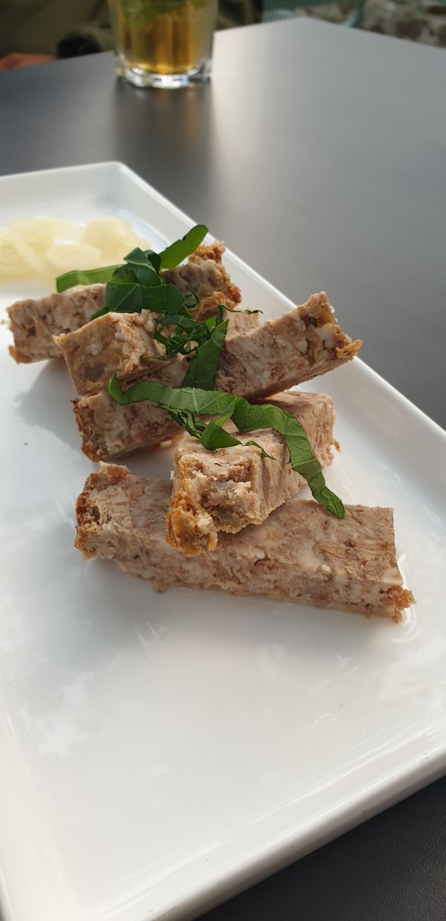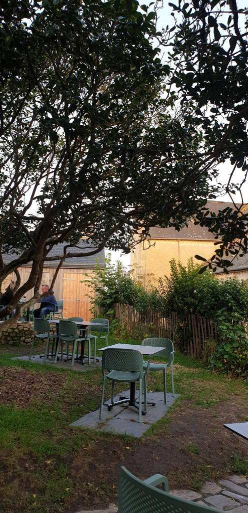 La carte est courte, avec 6 entrées, 4 plats et 4 desserts, qui évoluent constamment au fil des saisons. En septembre 2023, nous avons par exemple eu droit à du poulpe fumé, pommes à l’huile et pickles d’oignons rouges, de la tomme de vache d’Ouessant, tomate et basilic, olives taggiasca ou encore de la poitrine de cochon des Monts d’Arrée confite à la bière ambrée et pommes de terre grenaille.