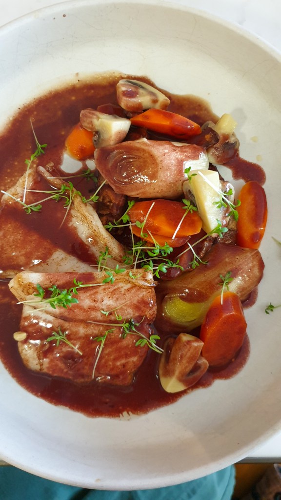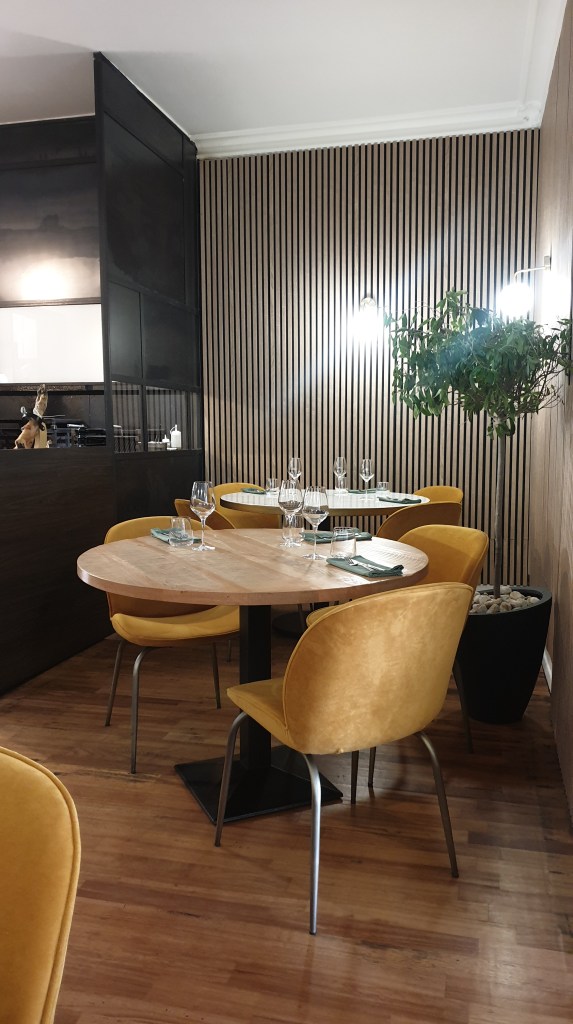 Dès l’arrivée, la bonne odeur de la cuisine au feu de bois envahit la pièce et met en appétit. Au déjeuner, il est possible de découvrir la formule au (très) bon rapport-qualité prix, qui change au moins une fois par semaine. Le jour de notre venue : crémeux panais, noix et lard, un vrai délice avec une belle longueur anisée en bouche ; des œufs mayo et sauce César, réveillés par une pointe justement dosé de salinité ; du sabre en matelote, une sauce au vin rouge non grasse et parfaitement équilibrée ; ou encore une tarte fine aux pommes simple et efficace.