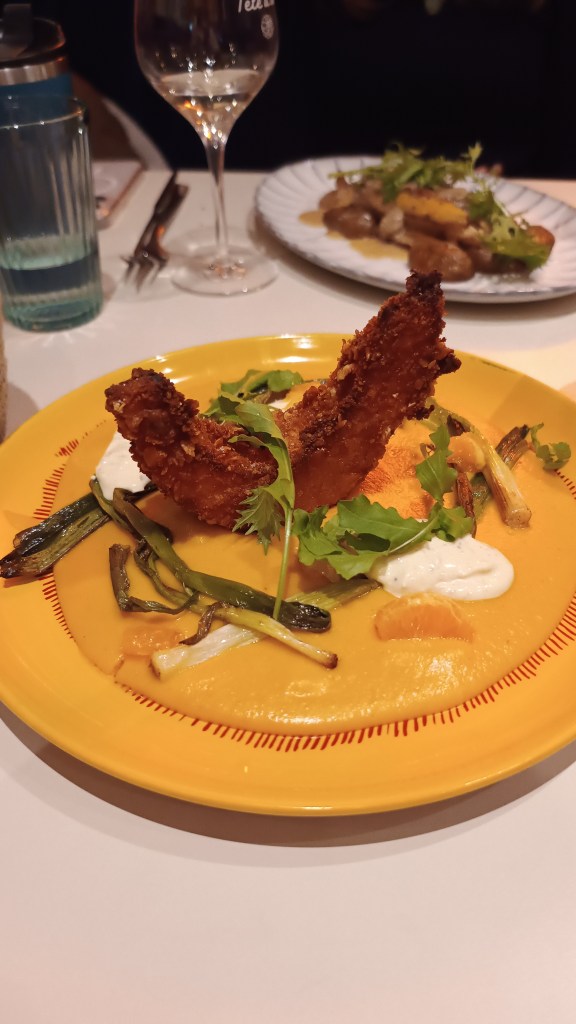 - Crémeux de courge accompagné de courge croustillante, une sauce blanche au vadouvan, de la ciboule grillée et une touche rafraîchissante de clémentine.