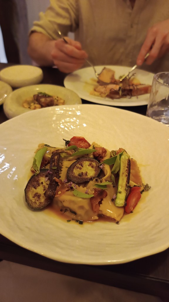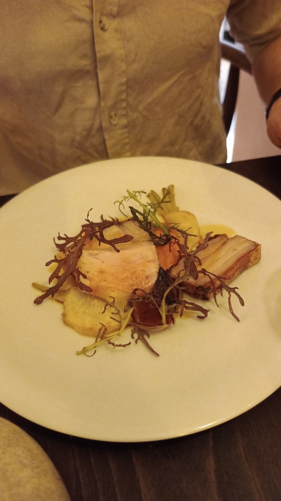 En plat, le cochon rôti fondant, accompagné de poivron et de cocos de Paimpol confits aux herbes, évoque un soleil estival. Les agnolotti glacés à la réduction de tomates et basilic du Kilimandjaro séduisent par leur intensité végétale et leur élégance.