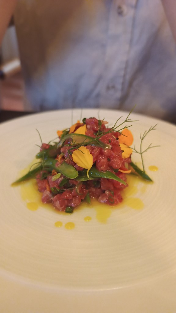 En entrée, l’araignée de la baie de Saint-Malo au concombre et huile de feuille de figuier livre une fraîcheur iodée et végétale. Le tartare de bœuf aux haricots acidulés, jaune d’œuf confit au sel et huile pimentée se révèle charnu, vif et relevé d’une note épicée.