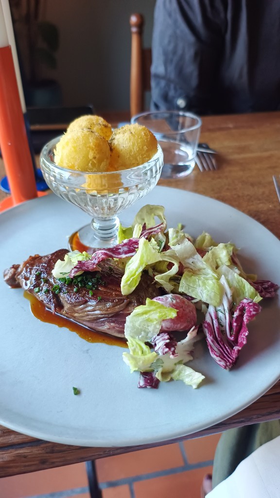Le repas débute par un thon délicat associé à la fraîcheur de la pastèque, relevé par une eau de tomate et un trait de sureau, créant un contraste surprenant et vibrant. À côté, une mousseline de pomme de terre onctueuse, accompagnée d’un jaune d’œuf confit et d’une peau de poulet croustillante, joue sur la tension entre la douceur et le croquant, enveloppant le palais d’une harmonie subtile et raffinée. Chaque bouchée révèle la précision des textures et l’équilibre des saveurs, annonçant la suite du repas avec promesse et gourmandise.