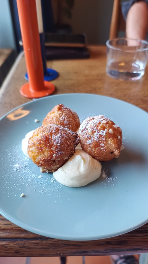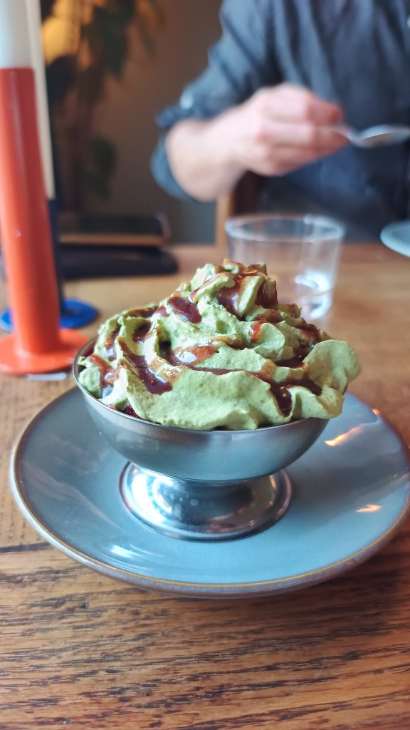 Le repas se conclut sur des notes sucrées délicates : une chouquette accompagnée de crème à la vanille de Bali fondante, qui libère un parfum enveloppant et gourmand, suivi de fraises fraîches, crème fouettée parfumée au basilic et un coulis d’olives de Kalamata, offrant un contraste audacieux entre douceur, fraîcheur et pointe saline.