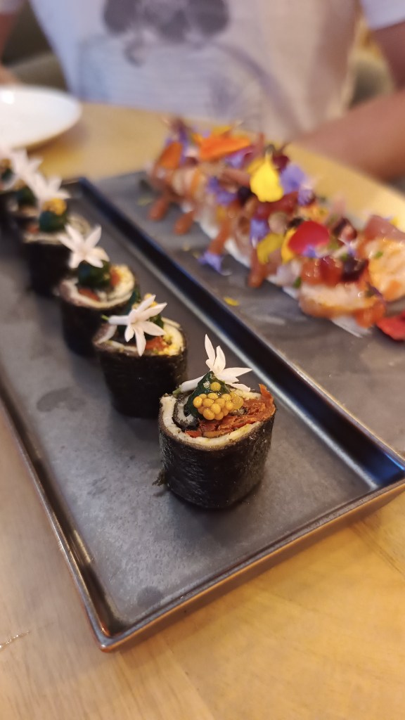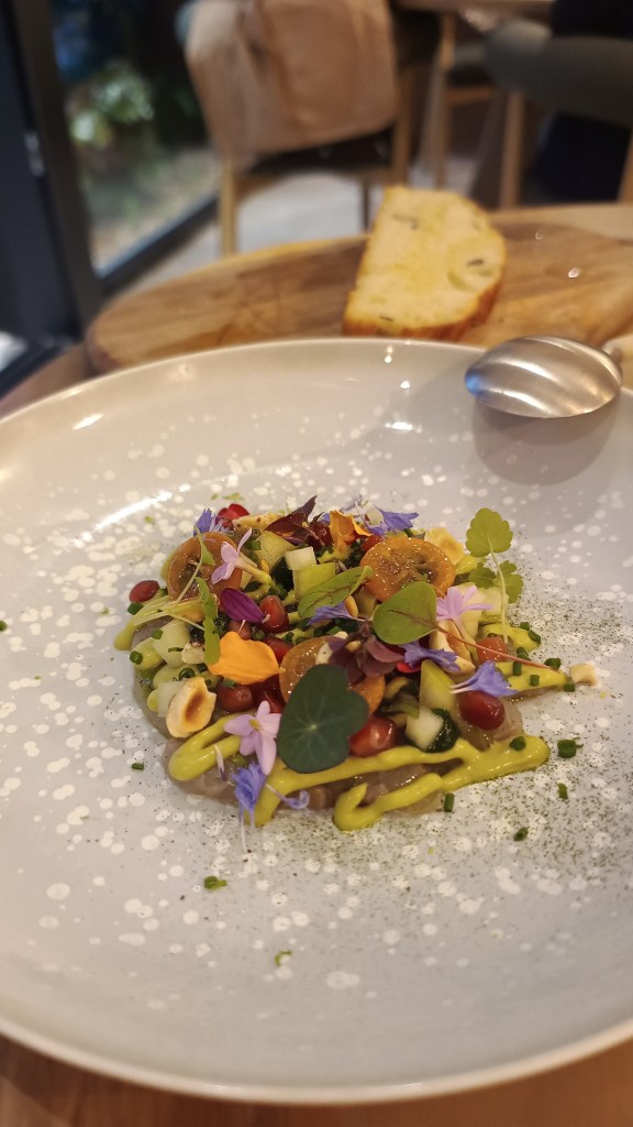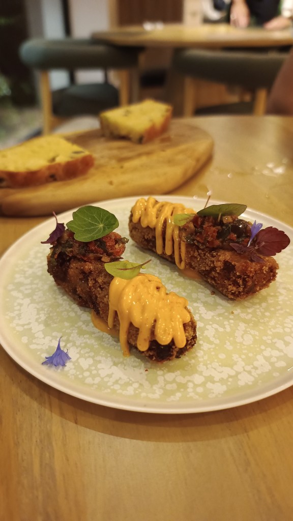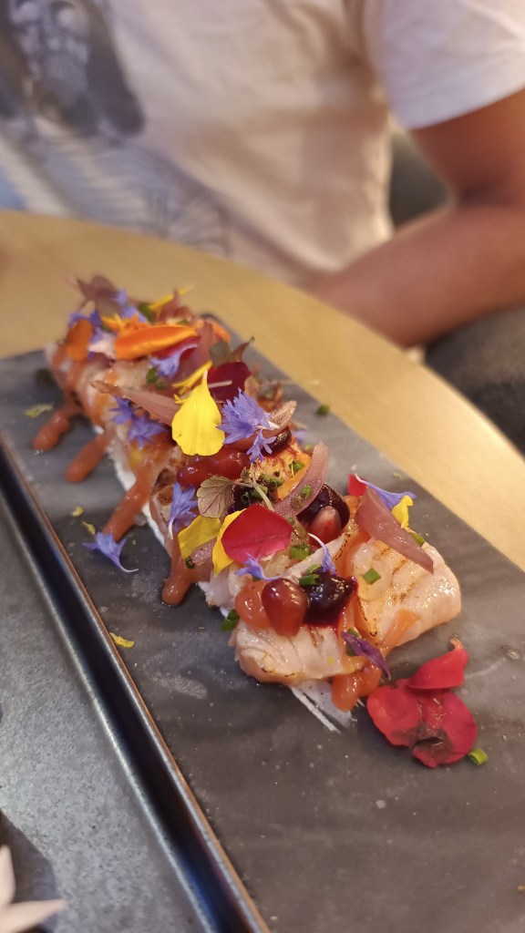 La carte du soir fait la part belle aux tapas créatifs, où le terroir breton s’ouvre à des influences venues d’ailleurs. Le gravlax de bar, rehaussé de condiments acidulés et de fleurs délicates, séduit par sa fraîcheur et son élégance. Le tataki de thon, traité avec la même finesse, joue sur des contrastes de textures et de saveurs. Plus réconfortantes, les croquettes d’agneau fondant s’accompagnent d’un condiment inspiré du tajine, épicé et parfumé, tandis que les makis de bœuf au basilic conjuguent générosité et originalité. Les beignets au comté apportent une touche croustillante et fondante, et la focaccia maison complète à merveille un caviar d’aubergine au chèvre frais, relevé de condiments qui intensifient la profondeur des saveurs.