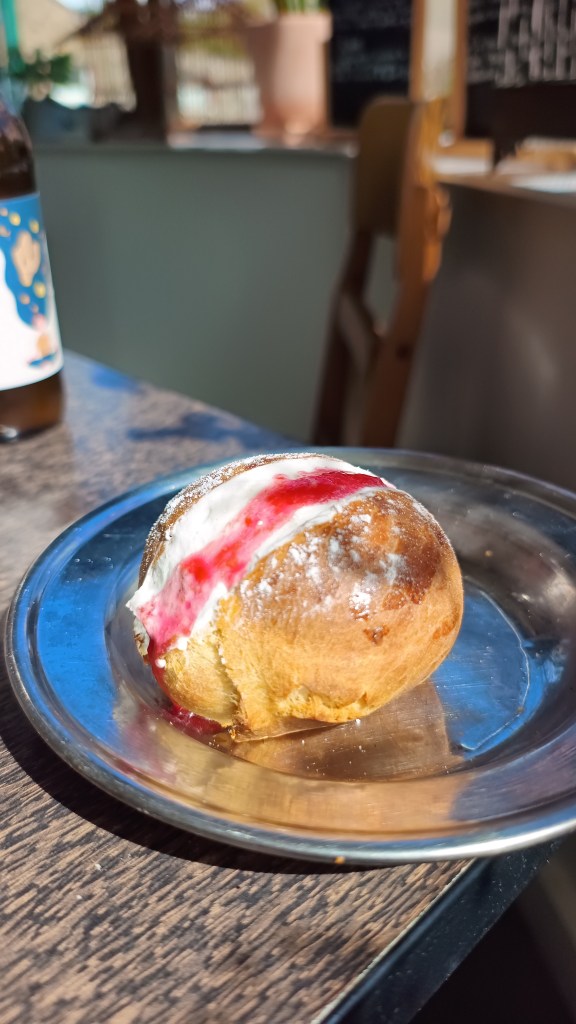 Pour finir sur une note sucrée, le bun brioché à la confiture de quetsches s’offre comme une douceur tendre et fruitée, rehaussée d’une chantilly légère. Un dessert qui prolonge l’esprit réconfortant du repas.