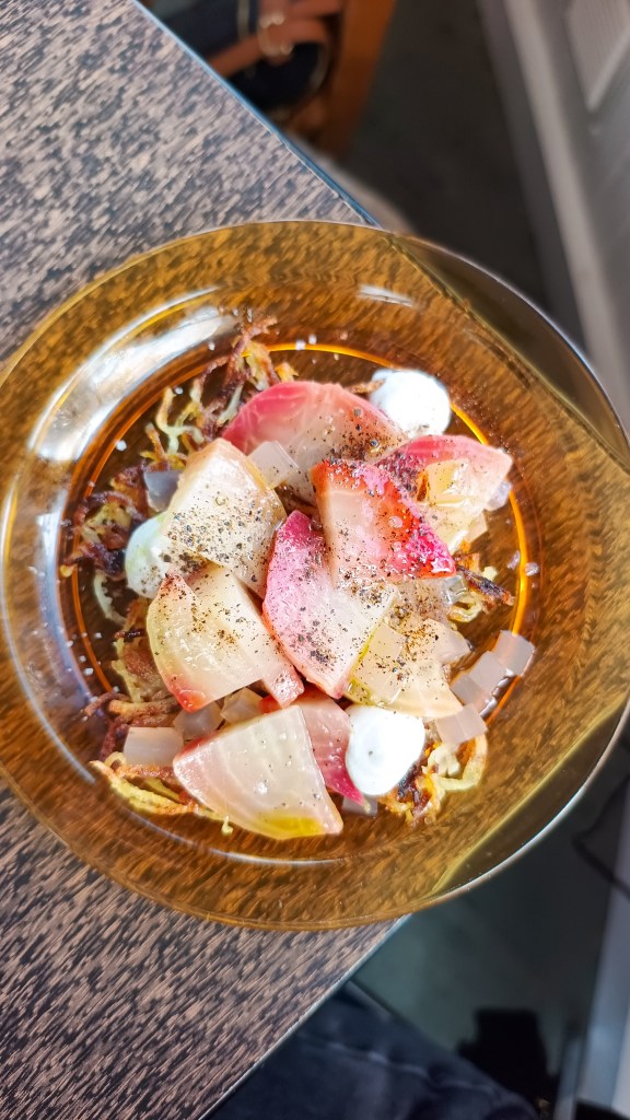 L’assiette met en avant des accords étonnants. Ainsi, le rösti croustillant se marie à une betterave en croûte de café, relevée par un gel de pastèque acidulé, un chèvre fouetté onctueux et une huile de figuier aux accents fruités. Les moules, quant à elles, trouvent une nouvelle dimension dans une version escabèche, adoucie par une crème délicatement fumée et une pointe végétale d’huile de céleri.