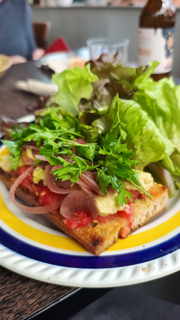 En plats, la tartine de focaccia arrive généreusement garnie : crème de brocolis veloutée, tomates juteuses, pickles d’oignons acidulés et salade croquante. Une composition simple et rassurante, qui ne manque pas de fraîcheur. La shakshuka mijotée, aux notes de tomates, poivrons et herbes parfumées, évoque le soleil méditerranéen. Elle se pare d’un œuf au jaune coulant et d’un yaourt battu qui équilibre le tout par une touche lactée et aérienne.