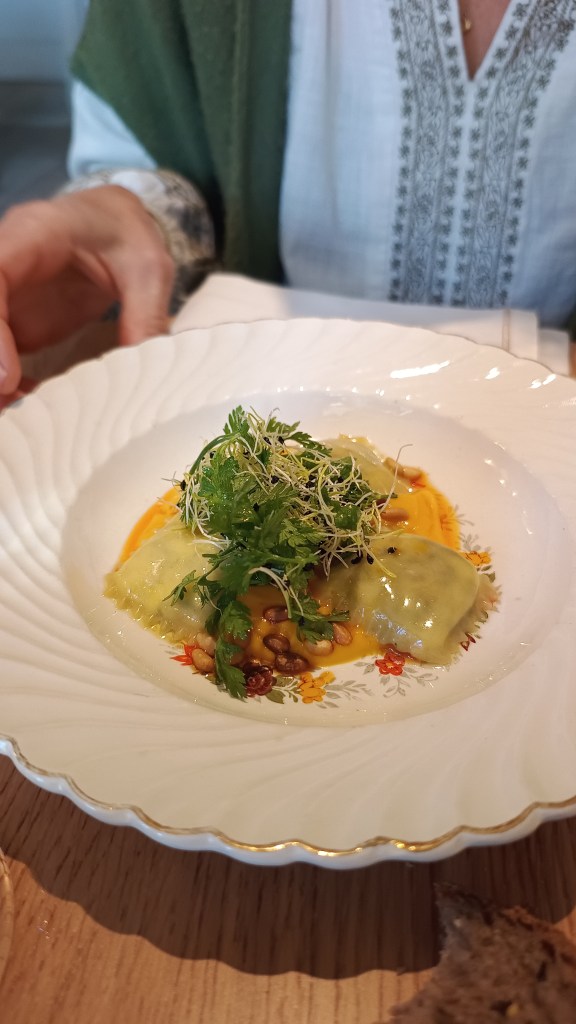À La Maison Alyette, la carte joue une partition équilibrée entre douceur et caractère, où chaque assiette raconte le plaisir du produit juste. En ouverture, les ravioles de ricotta et d’épinards, baignées dans une crème de butternut soyeuse, offrent un prélude à la fois réconfortant et lumineux : la pâte fine s’efface sous le fondant du fromage, tandis que la butternut apporte cette chaleur légèrement sucrée qui évoque les cuisines d’automne. En alternative, le saumon gravlax, travaillé avec soin, séduit par la délicatesse de sa texture et le contraste relevé d’une crème au raifort et à l’aneth. L’ensemble vibre entre fraîcheur nordique et onctuosité, une entrée à la fois simple et pleine de nuances.