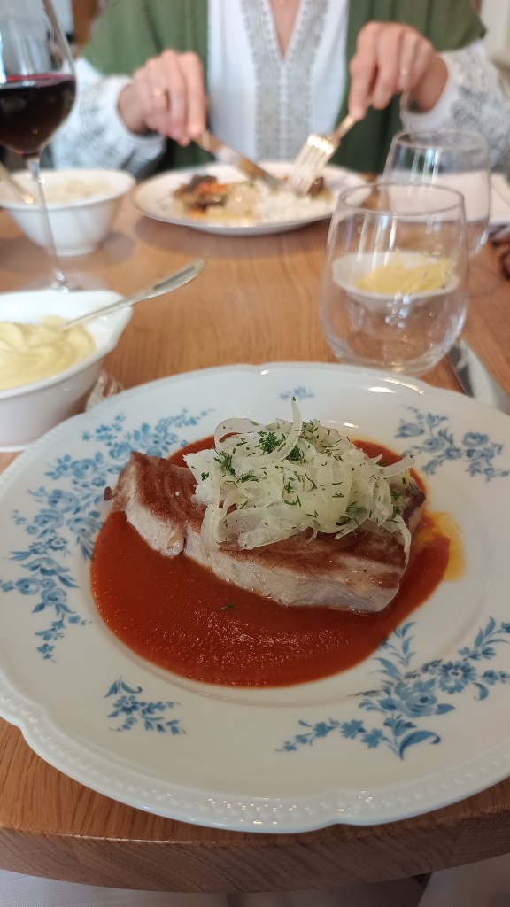 Viennent ensuite les plats, d’une belle sobriété maîtrisée. La blanquette de veau, longuement mijotée, révèle une chair tendre, nappée d’une sauce veloutée qui respecte le goût franc de la viande. À ses côtés, un riz pilaf cuit avec précision apporte sa légèreté et son grain juste nacré, pour une harmonie toute en douceur. Dans un registre plus marin, le thon grillé s’impose par sa cuisson parfaite, légèrement rosée au cœur. Le coulis de tomates, relevé d’une pointe d’agrumes et adouci par le fenouil, lui prête un accent méditerranéen vibrant. Une purée fine et lisse, d’une texture presque satinée, vient arrondir les angles, enveloppant le tout d’une touche de confort gourmand.