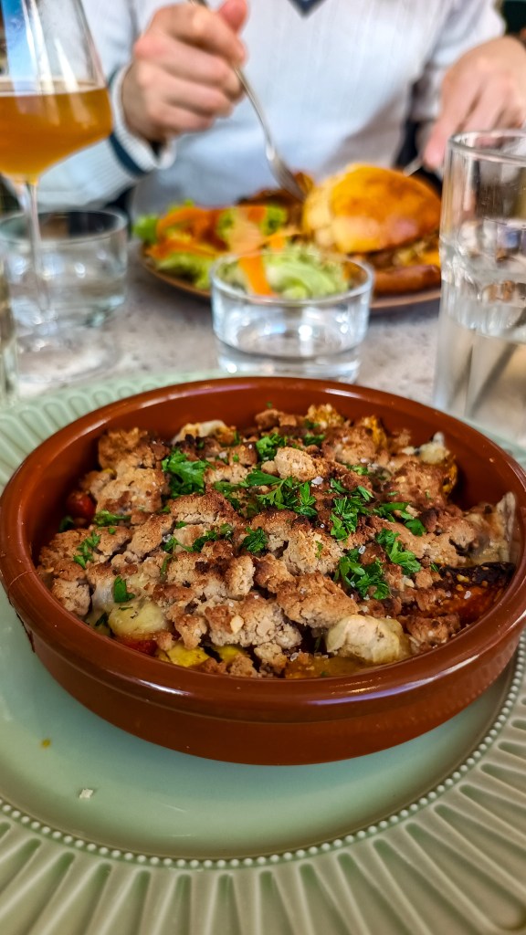 Le jour de notre passage, la carte affichait un burger au pulled pork d’une gourmandise renversante. Le porc, longuement confit au sirop d’érable et au cidre, se glissait entre deux tranches d’un bun maison, moelleux à souhait, accompagné de potatoes dorées. Un équilibre parfait entre douceur, acidité et caractère. En face, le crumble de courge à la farine de châtaigne offrait une partition plus végétale et subtile : le fondant sucré de la courge y rencontrait la profondeur boisée de la châtaigne, dans un jeu de textures aussi réconfortant que raffiné.