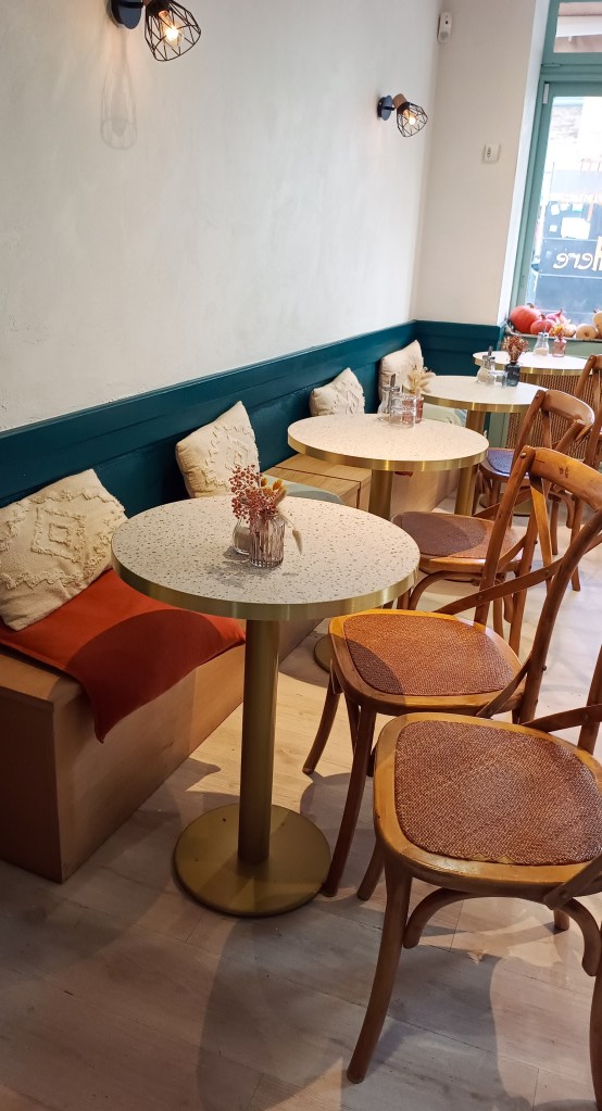 Le lieu, déployé sur deux niveaux, joue la carte de la transparence et de la convivialité. Une mezzanine ouverte sur le rez-de-chaussée permet de plonger le regard vers le comptoir, d’où s’échappent les effluves de café fraîchement moulu et de plats en préparation. En bas, l’agitation douce du service ; en haut, un cocon lumineux où l’on savoure son repas à l’abri du tumulte, tout en restant dans cette ambiance de vie partagée. Cet agencement, à la fois intime et vivant, contribue à l’âme d’Ose : celle d’un lieu où l’on se sent immédiatement à sa place.