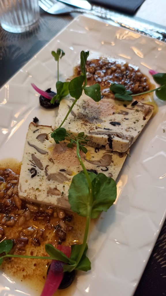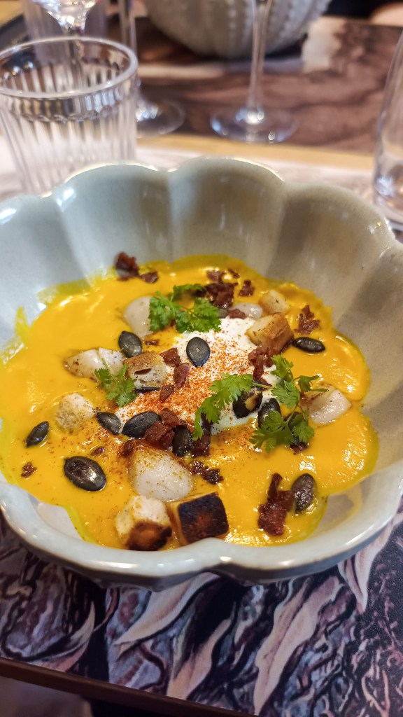 Le début du repas donne d’emblée le ton avec une terrine de volaille au foie gras et champignons des sous-bois, relevée d’une vinaigrette automnale. Le jeu des textures y est soyeux, délicat, et le parfum boisé des champignons enveloppe la richesse du foie gras sans lourdeur. La vinaigrette, vive et subtilement fruitée, apporte une pointe d’acidité qui allège l’ensemble et met en valeur la douceur de la volaille. L’autre entrée proposée ce jour-là révélait un tout autre registre : un cappuccino de potimarron, d’une onctuosité veloutée, ponctué de généreux morceaux de coquilles Saint-Jacques. Le fumet iodé des noix se mêle harmonieusement à la rondeur légèrement sucrée du potimarron, tandis que le bacon croustillant apporte une note fumée et salée, presque taquine. La chantilly à l’huile de courge, aérienne et parfumée, couronne l’ensemble d’une touche gourmande et inattendue, qui renforce l’esprit automnal du plat.