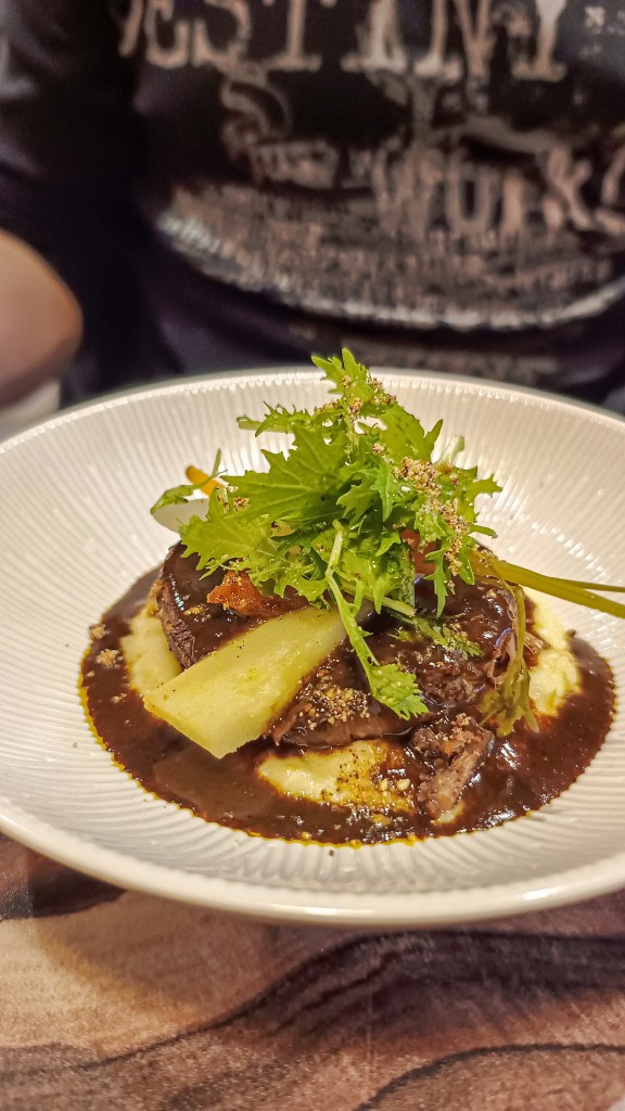 En plat principal, l’effiloché de paleron de bœuf se présente comme une assiette généreuse et réconfortante. La viande, longuement mijotée, se détache en fibres fondantes ; elle déploie une saveur profonde et chaleureuse, réveillée par une sauce savamment réduite. À ses côtés, la purée de pommes de terre, d’une douceur crémeuse, enveloppe le palais comme un nuage, tandis que les légumes de saison apportent une note plus vive, croquante, colorée, qui équilibre l’ensemble et lui confère une belle harmonie.