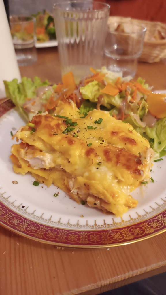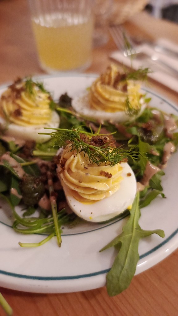 Côté cuisine, Rolande propose une carte courte mais maîtrisée, qui évolue régulièrement. Parmi les plats, on retrouve par exemple des lasagnes au poulet et au potimarron, alliance réussie entre gourmandise et saisonnalité, ou encore l’œuf mayonnaise relevé au piment d’Espelette, revisite simple et efficace d’un grand classique.
