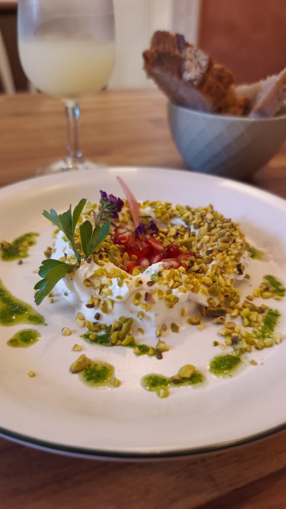 Le menu reflète une cuisine où la tradition rencontre l’inventivité : le labneh pistache zaatar grenade joue sur les parfums du pourtour méditerranéen, tandis que le feuilleté de brie à la truffe, crème de carotte à l’orange et chiffonade de fenouil conjugue texture et profondeur aromatique. Les desserts – comme une panna cotta au coulis de fruits rouges et amandes effilées – clôturent le repas sur une note délicate, légère et gourmande. Ces créations illustrent l’attention portée aux produits, à leur provenance et à leur transformation.