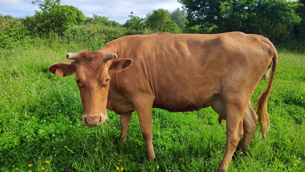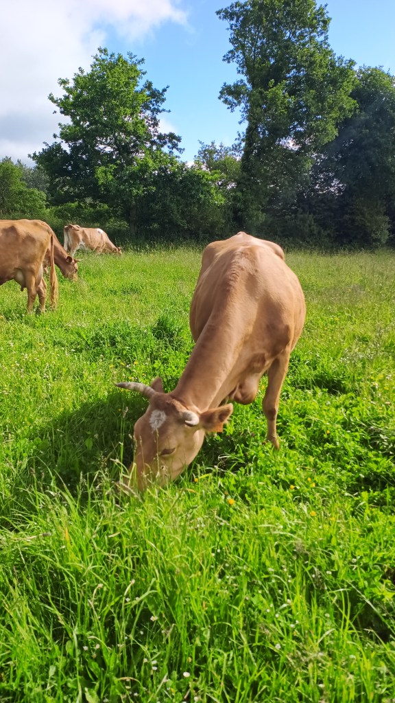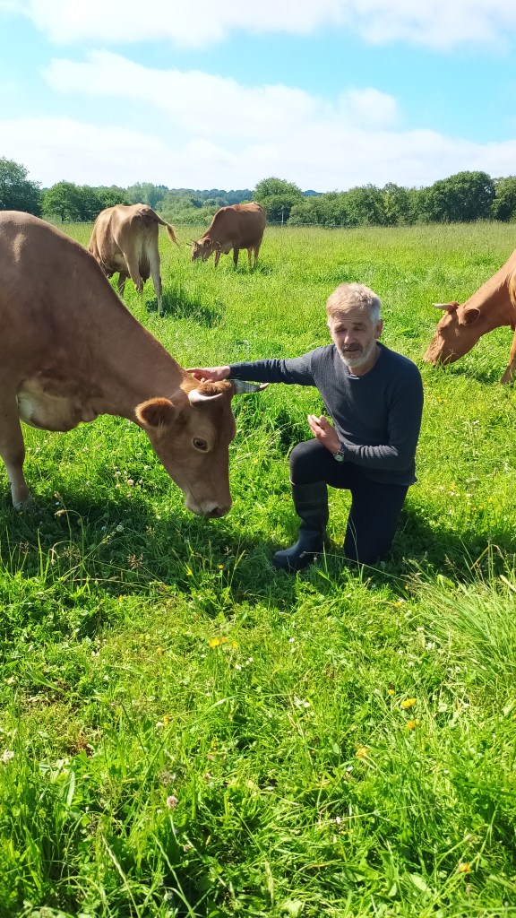 La ferme Couleur Froment — installée au lieu-dit Gueïder — est avant tout celle de Stéphane Terlet, qui a fait le choix de travailler avec une race rare et typique de Bretagne : la Froment du Léon. Ces vaches au pelage doré et au tempérament calme pâturent en plein air sur des prairies vallonnées, donnant un lait particulièrement riche et aromatique, base essentielle d’un beurre au profil très marqué.